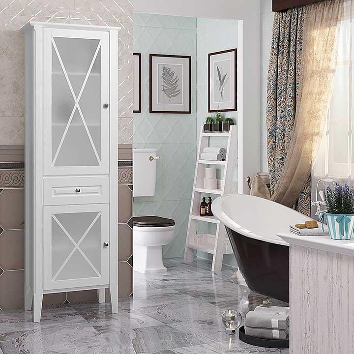 Коллекцию прекрасно дополняет высокий напольный пенал с дверцами с матовым стеклом и выдвижным ящиком.
