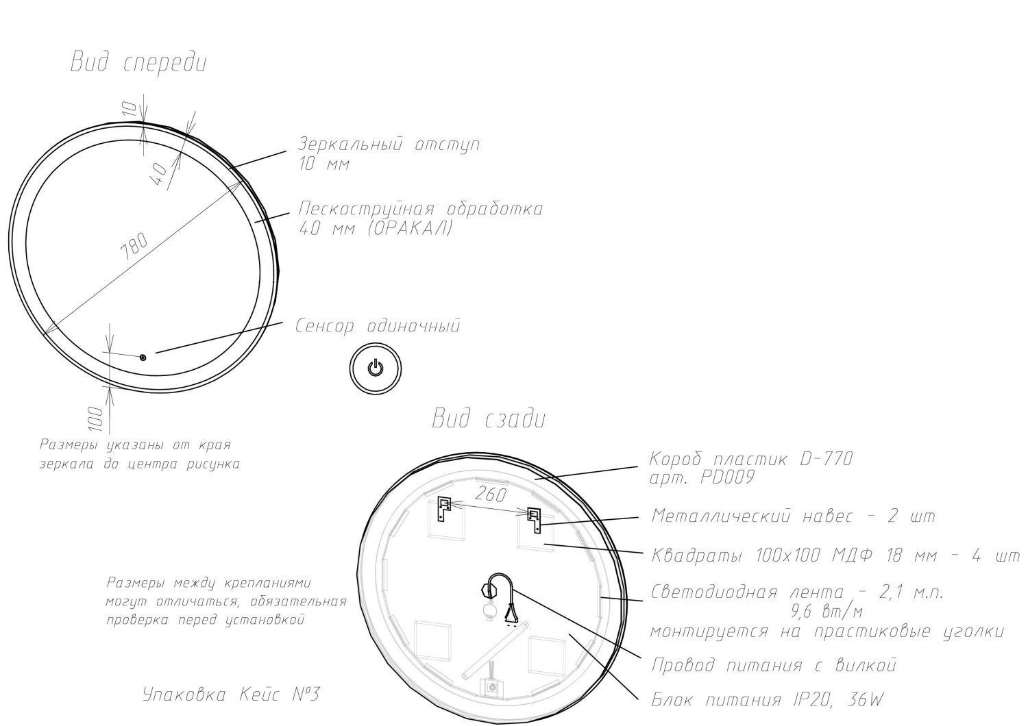 Корпус из УПС-пластика, зеркальный отступ по периметру, без косметической линзы, теплая подсветка