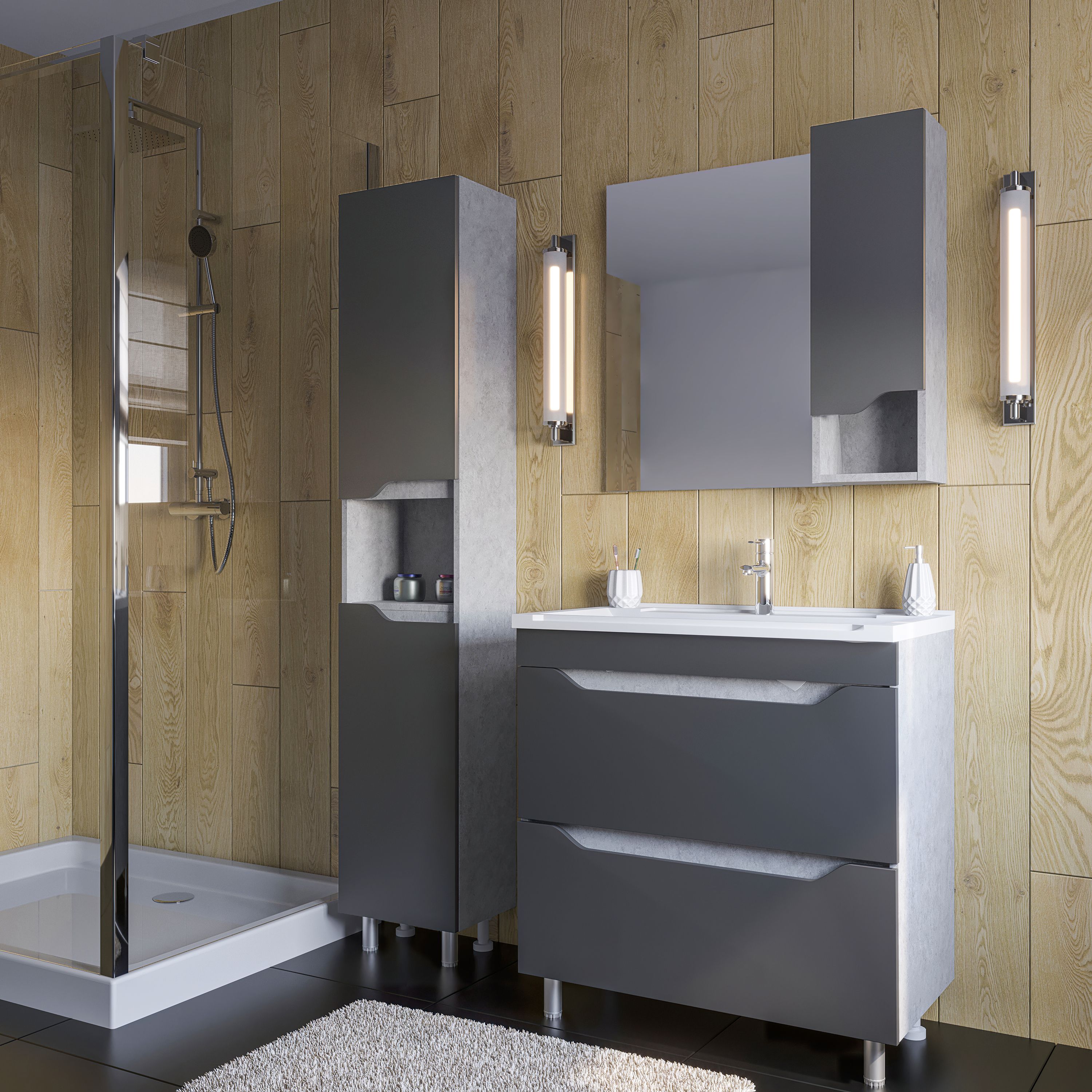 Стильный вид модели "Абигель" построен на сочетании цветов светлого цемента по бокам с темным графитом на фасаде. Фасадная пленка темно-серая - «Soft Touch», которая никого не оставит равнодушным из-за бархатистой и весьма приятной на ощупь поверхности.Фасады и боковины толщиной 16 мм. Комплектация: удобное открывание за фасад, петли с доводчиком.