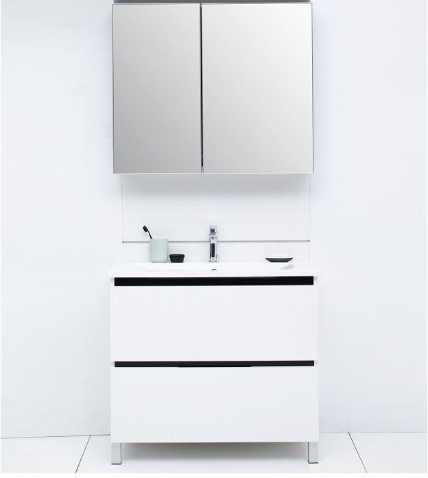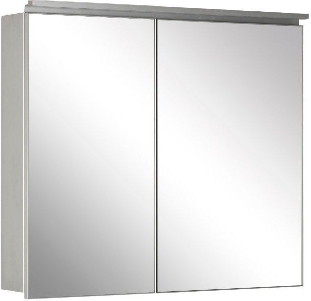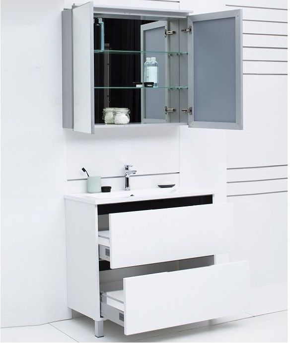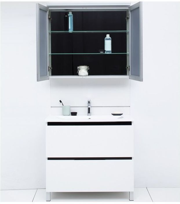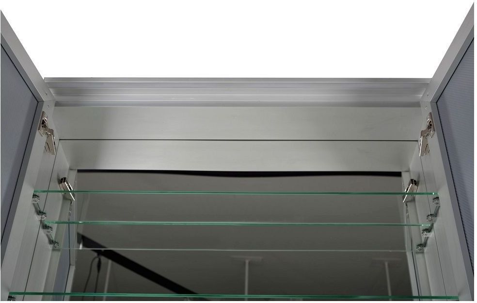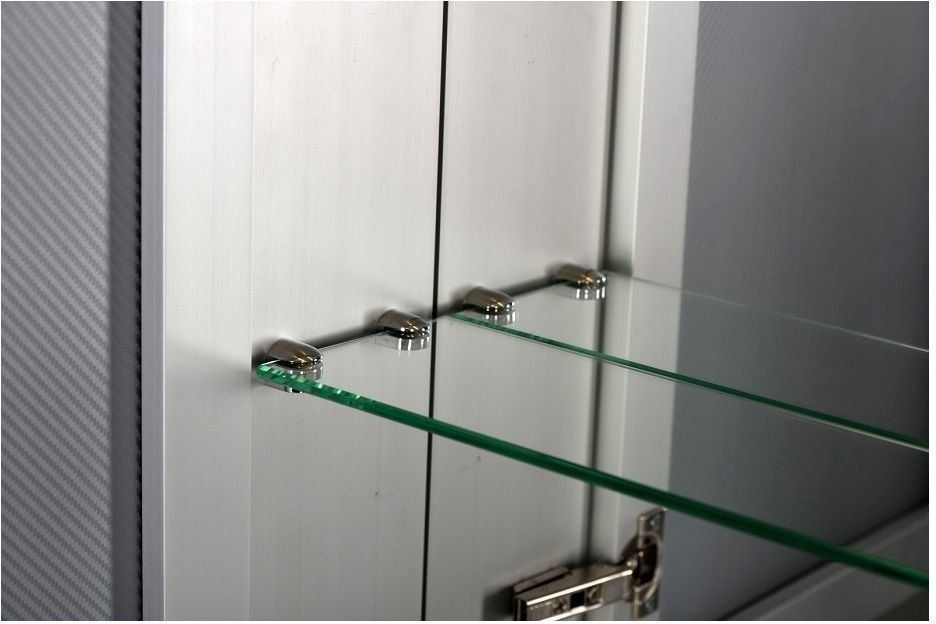 Зеркало-шкаф De Aqua 80 (серебро) в алюминиевом корпусе содержит большую зону хранения за двумя распашными дверцами. Ширина - 80 см, полочки внутри сделаны из стекла.