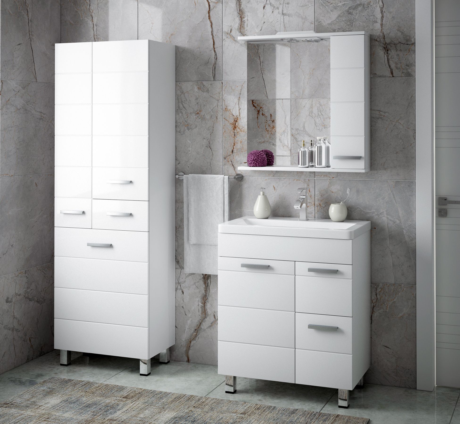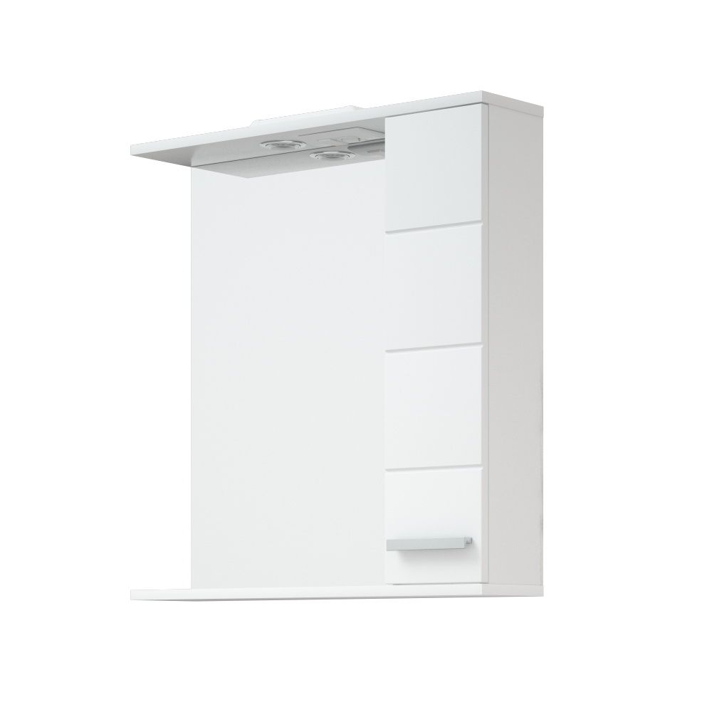 Коллекция "Денвер" - это вдохновление четкостью линий модернизма! Линейка выполнена из влагостойкого МДФ, покрытого белой глянцевой пленкой. Мебель комплектуется фурнитурой высокого качества, дверными петлями со встроенными доводчиками и удобными наклонными ручками. Линейная фрезеровка на фасадах придаст индивидуальность и задаст особый ритм Вашей ванной комнате. Зеркало-шкаф оснащён распашной дверью справа, слева находится зеркало. За дверью расположены полочки. Петли с доводчиками. Зеркало-шкаф - с подсветкой, 1 светильник. Фасад, верхняя и нижние крышки - МДФ в плёнке.