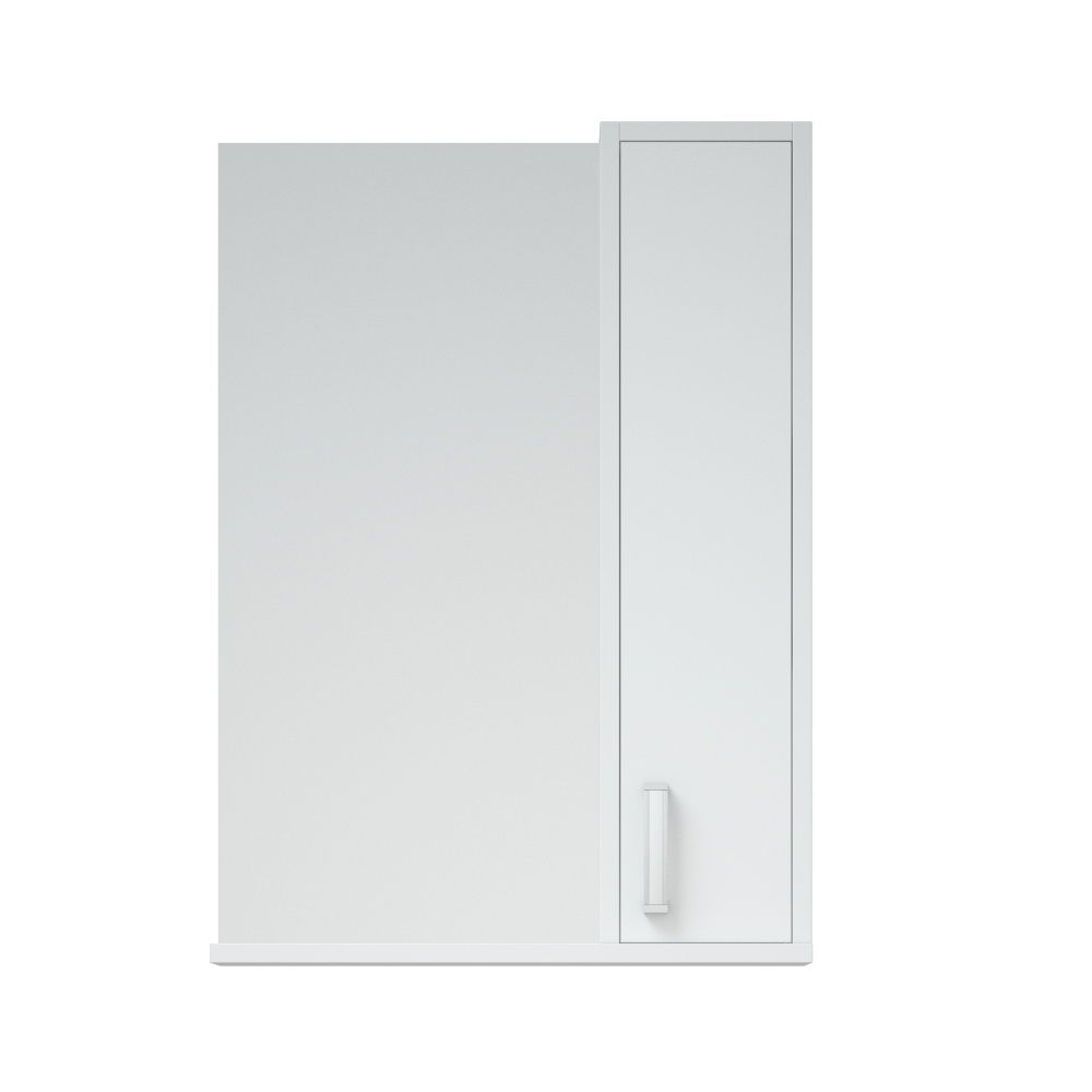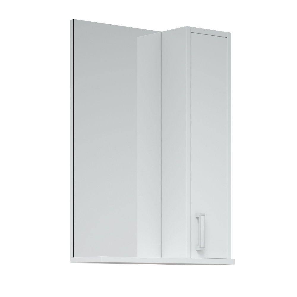 Шкаф оснащён распашной дверью справа, слева зеркало. Полка снизу. За дверью 2 вкладные полочки. Дверь - крашенная матовой эмалью. Нижняя крышка - МДФ в плёнке.