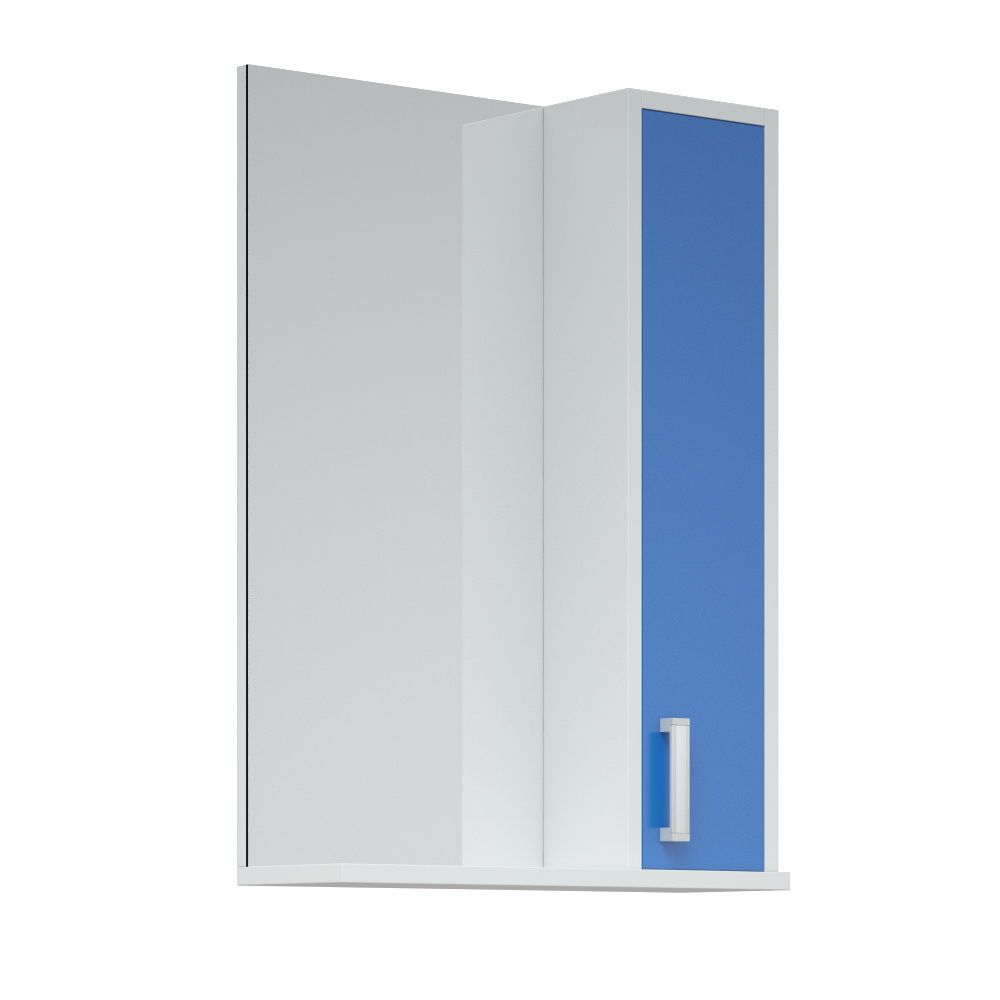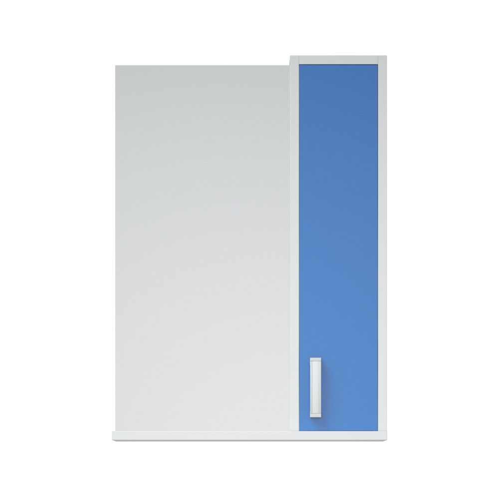 Шкаф оснащён распашной дверью справа, слева зеркало. Полка снизу. За дверью 2 вкладные полочки. Дверь - крашенная матовой эмалью. Нижняя крышка - МДФ в плёнке.