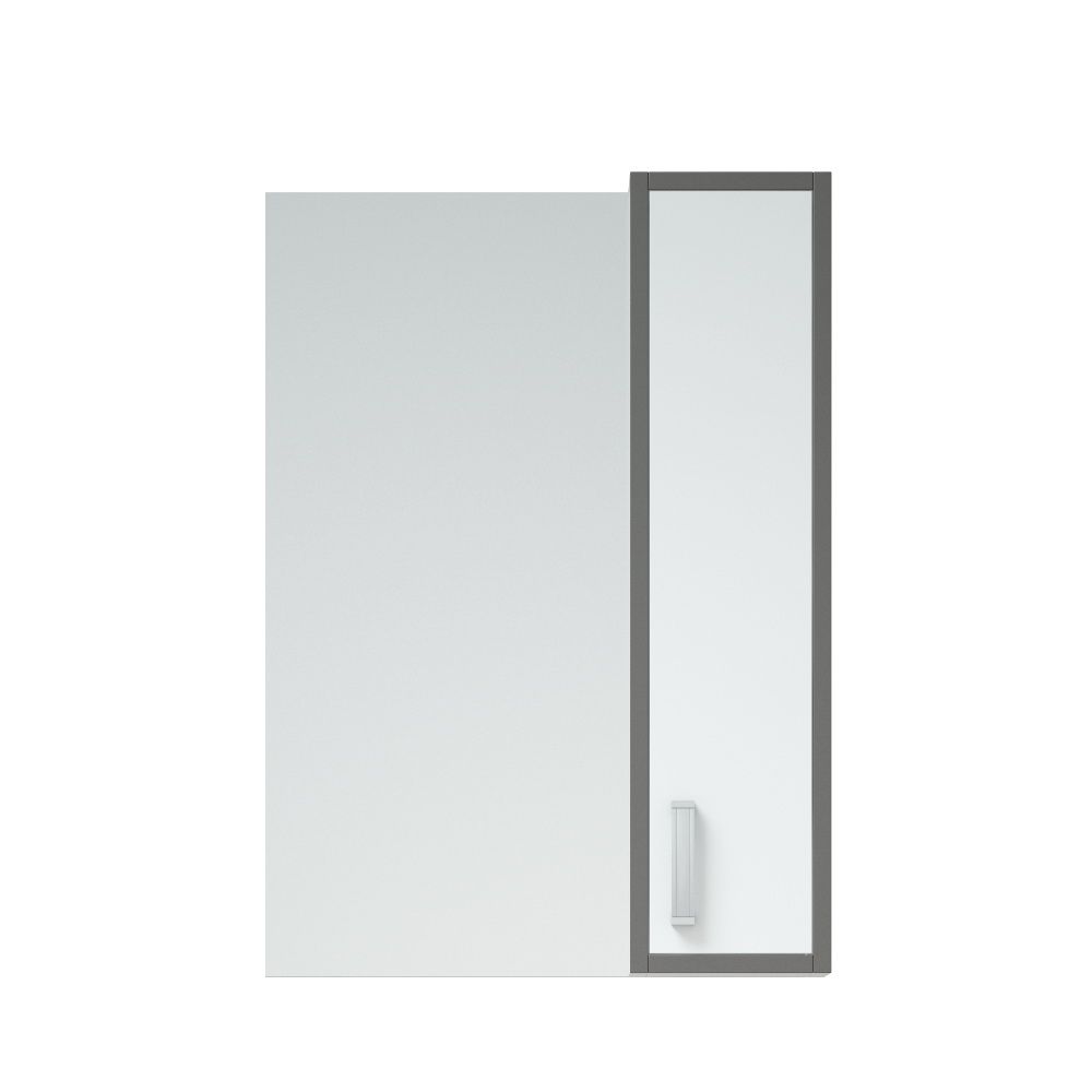 Шкаф оснащён распашной дверью справа, слева зеркало. За дверью 2 вкладные полочки. У зеркала-шкафа цветным является кромка с видимой части. В ручку вставлена такая же по цвету кромка, что придает изделию особый шарм. Дверь - крашенная белой эмалью.