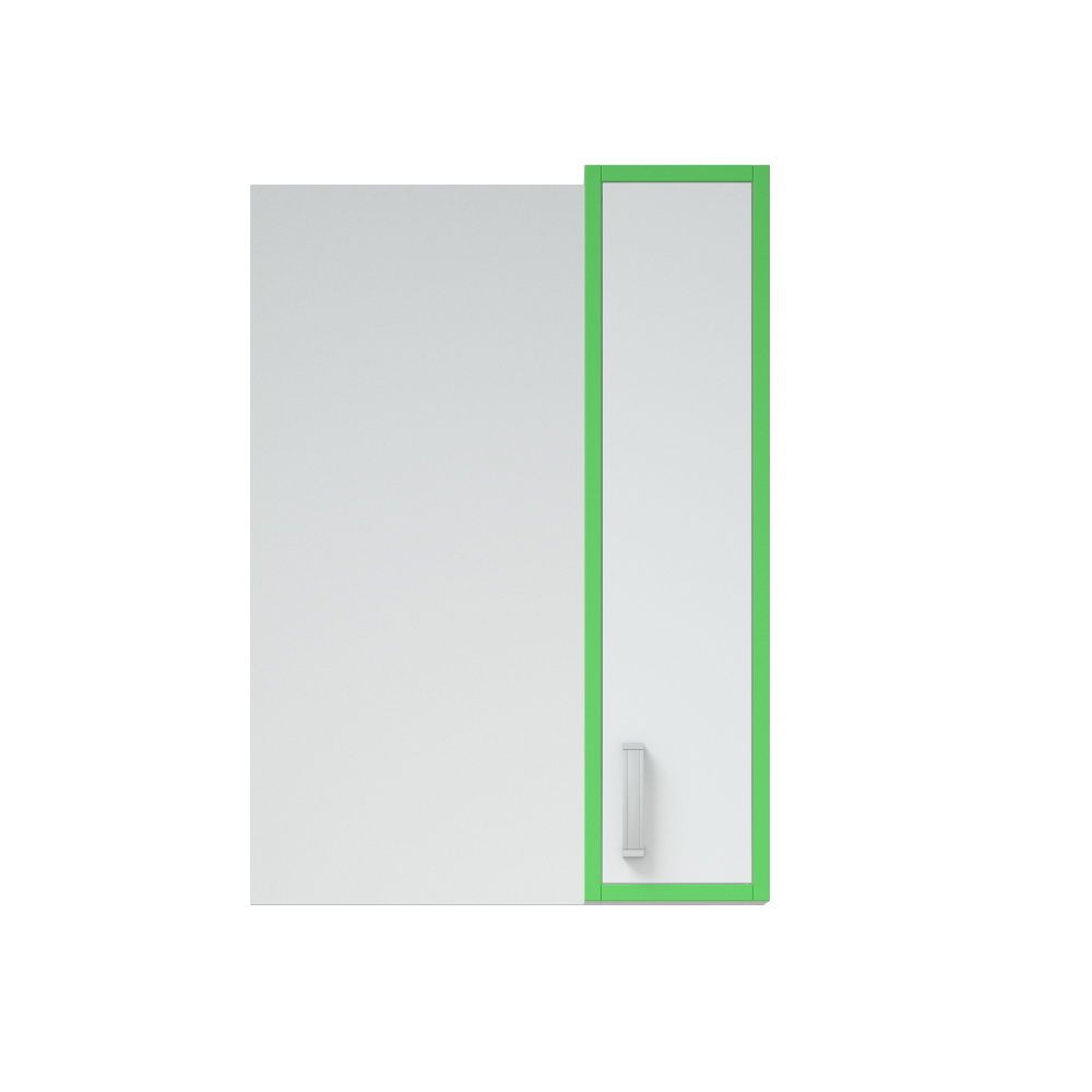 Шкаф оснащён распашной дверью справа, слева зеркало. За дверью 2 вкладные полочки. У зеркала-шкафа цветным является кромка с видимой части. В ручку вставлена такая же по цвету кромка, что придает изделию особый шарм. Дверь - крашенная белой эмалью.