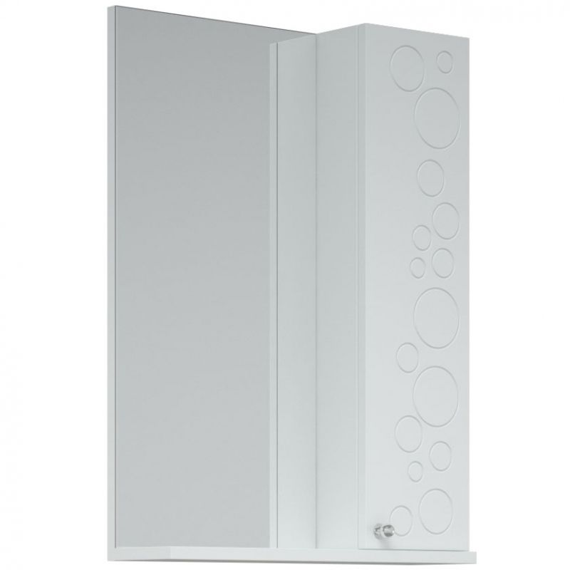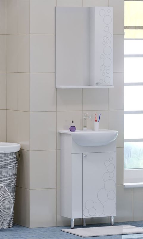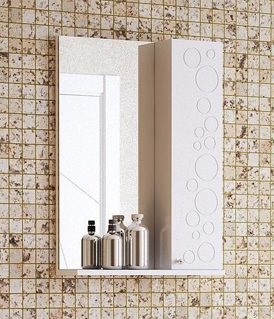 Зеркальный шкаф оснащён распашной дверью справа, слева - зеркало. За дверью 2 полочки. Верхняя, нижняя крышки, дверь - МДФ в плёнке ПВХ, корпус ЛДСП. Фрезеровка в виде пузырьков.