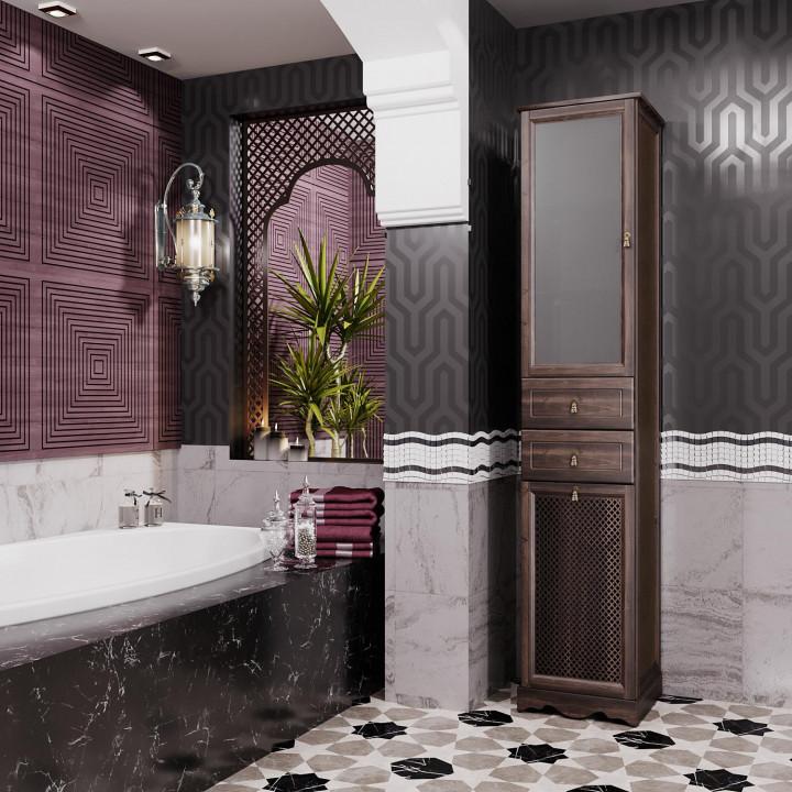 Нижний фасад пенала Тибет в цвете Орех антикварный предлагается с декоративной решеткой и бельевой корзиной.